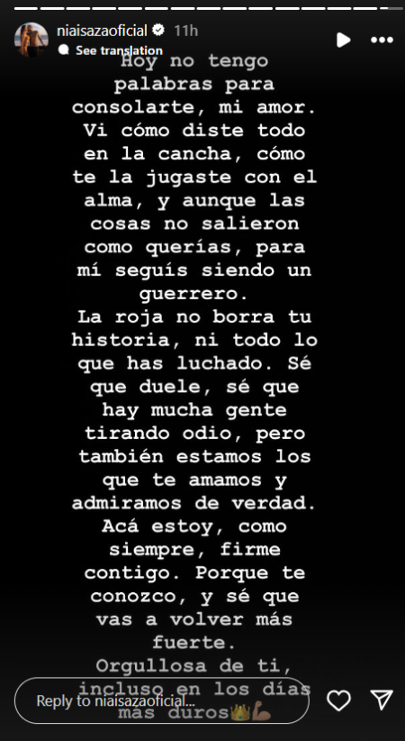 "Vi cómo diste todo en la cancha, cómo te la jugaste con el alma, y aunque las cosas no salieron como querías, para mí sigues siendo un guerrero", agregó.
