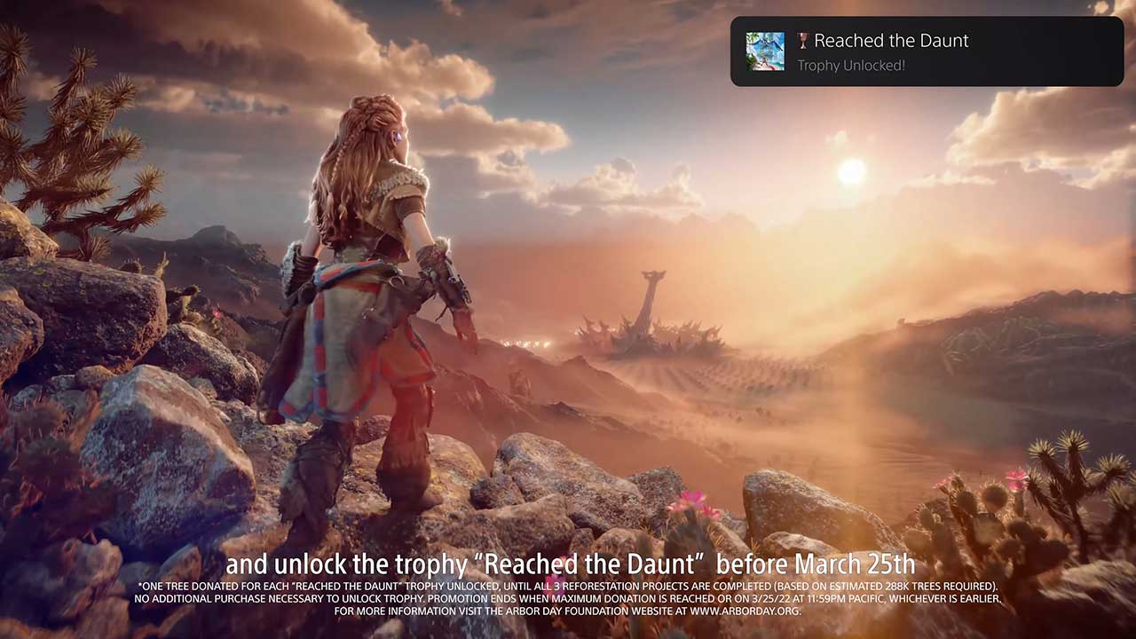 Sony recientemente anunció el programa “Juega y planta”, el cual está enmarcado en el estreno de su juego Horizon: Forbidden West. La idea es simple: se donará un árbol por cada jugador que consiga uno de los trofeos iniciales del título. La donación se hará a un proyecto de recuperación forestal.