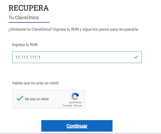 Solo debes entrar al siguiente link https://claveunica.gob.cl e ingresar a la opción “recuperar”. Luego deberás indicar tu RUT y dar clic a “No soy un robot” antes de continuar.