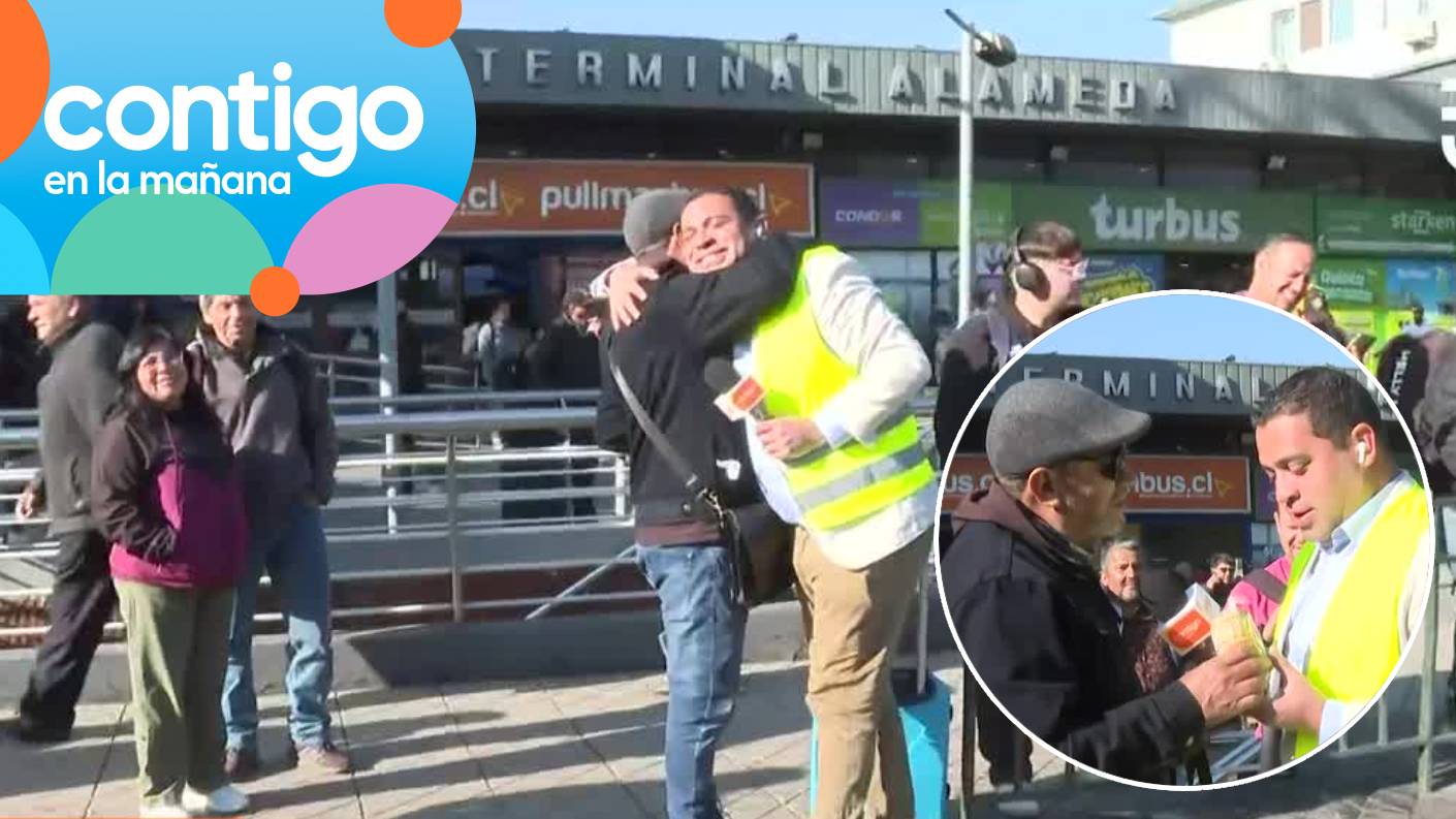 Tomás Cancino estaba despachando desde Estación Central cuando, de manera sorpresiva, una persona lo saludó cariñosamente durante el enlace. El periodista conversó con el ciudadano y compartió por qué recibió un regalo en vivo.