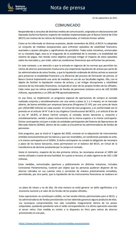 También, manifestaron que"en atención a que la entrada en vigencia de las normas que permitían los retiros de ahorros previsionales involucraría una importante liquidación de activos por parte de las administradoras de estos fondos, y que la liquidación ordenada de dichos activos es esencial para preservar la estabilidad financiera y la eficiencia del proceso de formación de precios, el Banco Central implementó una serie de medidas en uso de sus facultades legales. Ello, con el objeto de facilitar la liquidación masiva de activos, y así mitigar disrupciones y volatilidad excesiva de los mercados financieros, incluyendo el valor de los propios fondos de los afiliados".