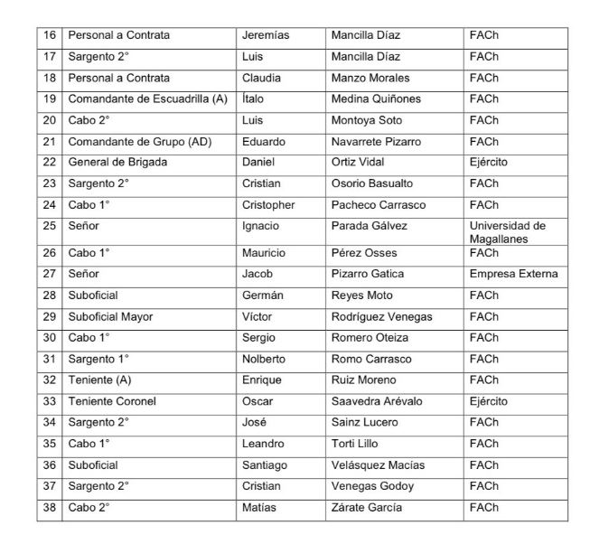 A través de su cuenta de Twitter, la Fuerza Aérea de Chile dio a conocer la identidad de los 17 tripulantes y 21 pasajeros que abordaron el avión Hércules C130 rumbo a la Antártica.