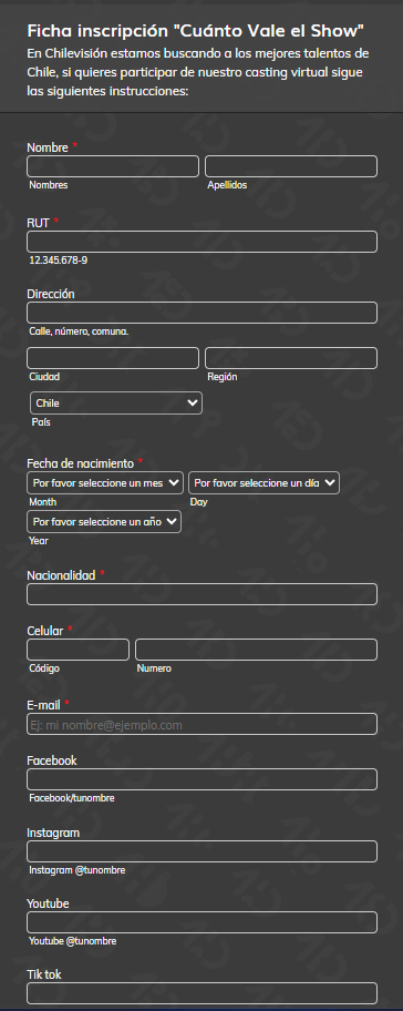 Enseguida, se desplegará una nueva ventana donde pedirá diferentes datos personales para los interesados y que tendrás rellenar con tu nombre, RUT, dirección, país, fecha de nacimiento, nacionalidad, teléfono personal, e-mail y redes sociales.