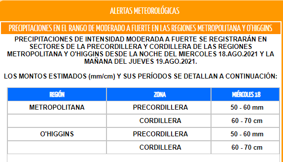 En tanto, la Dirección Meteorológica de Chile (DMC) emitió una alerta por “precipitaciones de intensidad moderada a fuerte en la cordillera y la precordillera de las regiones Metropolitana y O’Higgins” para la noche de este miércoles (18 de agosto) hasta la mañana de este jueves (19 de agosto) con montos cercanos a 60 milímetros de agua.
