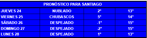 Santiago volverá a recibir chubascos débiles, algo muy similar a lo de hoy, durante este viernes por la tarde. A partir del fin de semana cambiará radicalmente la situación meteorológica, ya que aparecerán las heladas con registros que podrían llegar a -5° en los valles del centro-sur del país. En la capital, además de la mala ventilación, la mínima rondaría -2° este domingo 27 de junio y sin la opción de lluvias a la vista en el mediano plazo.