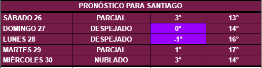 En la ciudad de Santiago también habrá heladas con 0° de mínima para el domingo y -1° este lunes, por lo cual habrá comunas como Pudahuel, Maipú, San Bernardo, entre otras, que podrían rondar -2°, e incluso, -3° de mínima durante estos días.