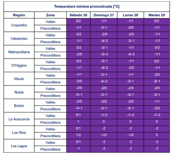Y después de las lluvias, el frío extremo marcará el fin de semana largo en gran parte del país. Por lo mismo, la Dirección Meteorológica de Chile (DMC) emitió un aviso por “heladas normales a moderadas desde Coquimbo hasta Magallanes” con mínimas bajo cero en los valles y la precordillera a partir de este sábado 26 de junio y hasta el martes 29 de junio.