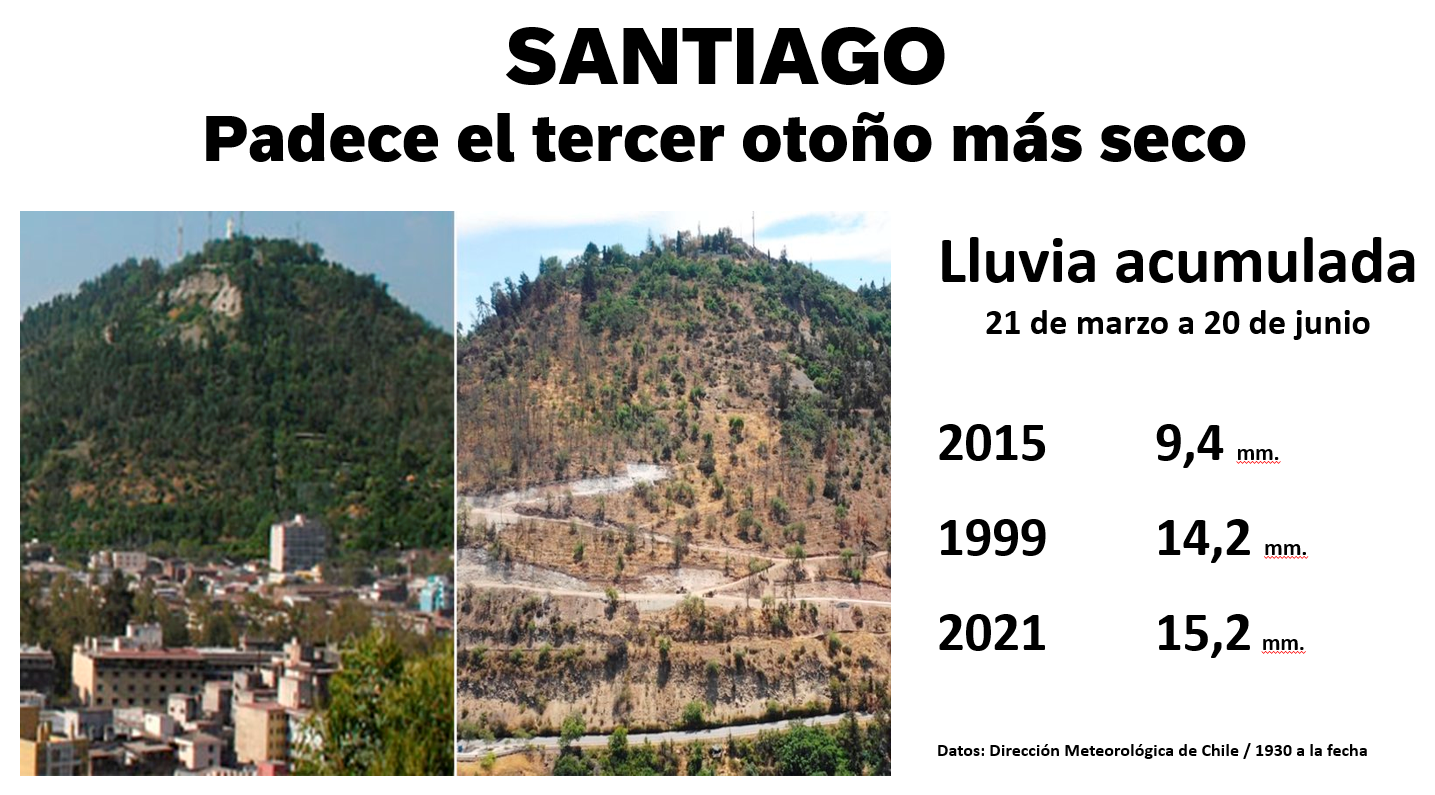 ¡Sequía total! Santiago padece el tercer otoño más seco en, por lo menos, 90 años de registros. Durante la presente estación, la capital acumula apenas 15,4 milímetros de agua caída producto de la única lluvia relevante que recibió en el trimestre el pasado 20 de mayo. Esta marca de sequedad la superan sólo los otoños de 2015 y 1999.