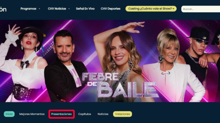 El primero es a través de la página web de Chilevisión.cl. Debes dirigirte a la sección Fiebre de Baile y buscar la pestaña "Presentaciones" para acceder a todos los bailes de los famosos.
