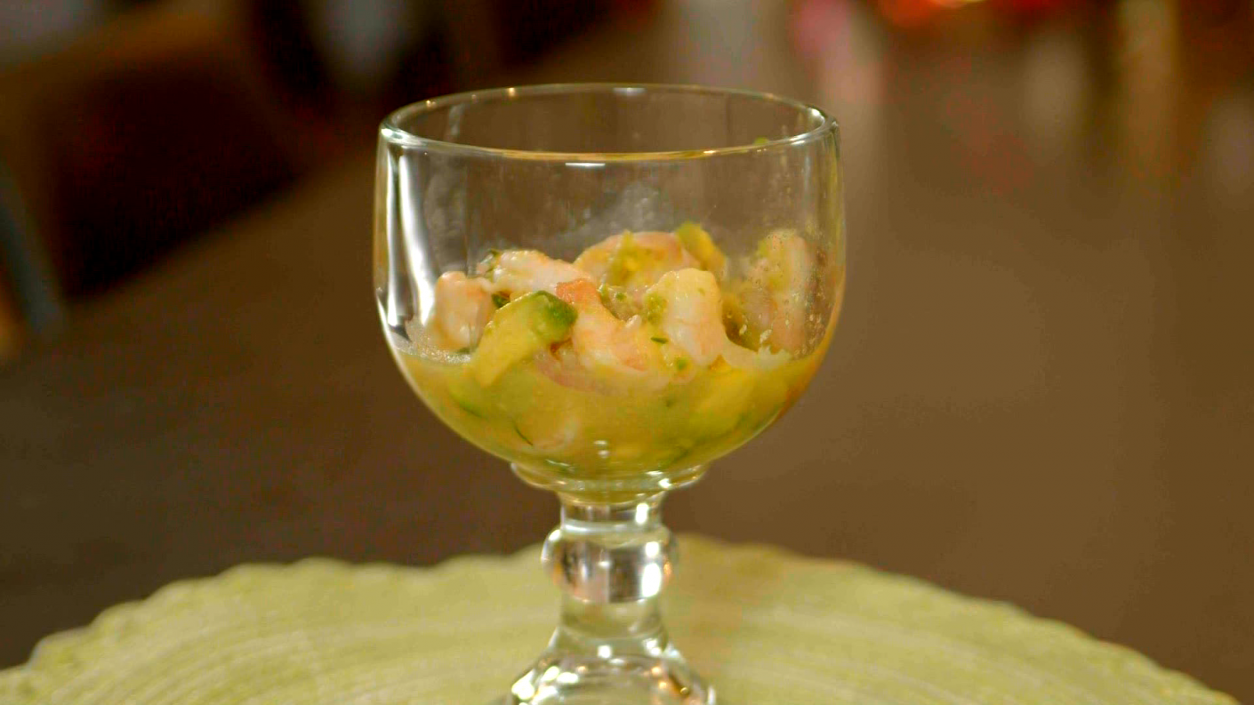 Lavar y cocer los camarones, aderezar con sal a gusto y agregar el perejil picado, el ají y la cebolla. Incorporar abundante jugo de limón, aceite de oliva y finalmente la palta. Revolver hasta mezclar bien todo y servir en copas individuales.
