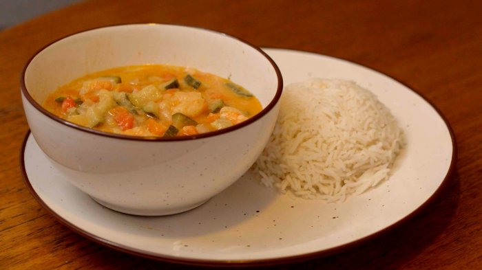 Servir un pocillo del curry con los camarones, los ostiones y unas gotitas de jugo de limón. Acompañar con arroz basmati.