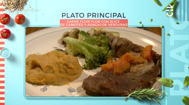 "Carne Flow Flor con Slice de Camotes y Adagio de Verduras" de Claudia Miranda
