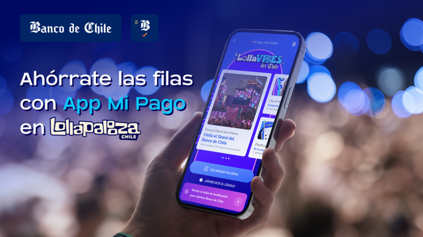 "En Lollapalooza 2023 tuvimos un muy buen debut, con cerca de 20 mil cargas exitosas de pulseras a través de nuestra app Mi Pago" , señaló Rodrigo Devia, gerente de Transformación Digital de Banco de Chile.