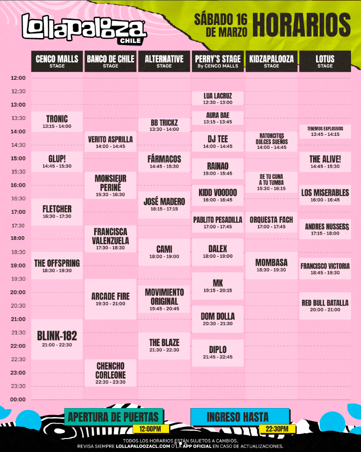 La apertura de puertas es a las 12 del día, horario en que podrán ingresar los asistentes para disfrutar a sus artistas favoritos, quienes estarán repatidos por los diferentes escenarios, y se permite ingresar al recinto hasta las 22:30 horas.