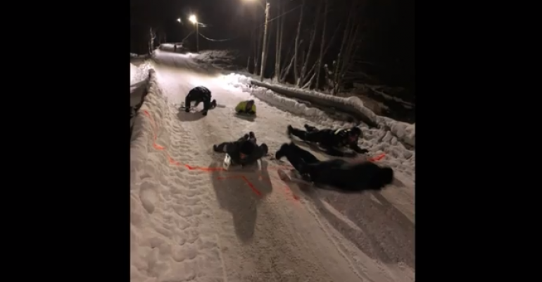 Un grupo de policías noruegos de la localidad de Trondheim aprovecharon el clima de su ciudad para divertirse con sus escudos de protección.