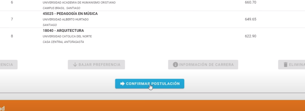 Si bien se seleccionaron las carreras, la postulación no está terminada. En este paso se deben ordenar según la preferencia personal por orden de mayor a menor interés, hasta un máximo de 10. Recién ahí se recomienda hacer click en la sección "confirmar postulación", donde se volverá a pedir la contraseña personal.