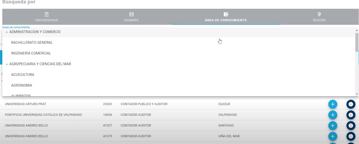 Una vez dentro, se abrirá la pestaña que permite la selección de carreras. Aquí, están las modalidades universidad, nombre, área de conocimiento y región. Una vez encontrada, se debe hacer click en "+" para el agregarla en el listado personal o el "i" si se quiere conocer más información como requisitos o ponderaciones.