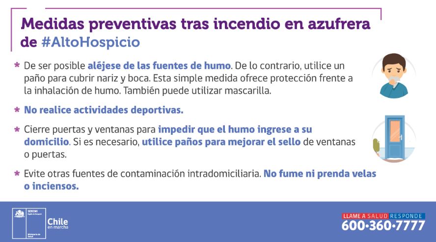 A través de un comunicado, El Gobierno Regional de Tarapacá informó que a las 17:00 de este sábado, los focos de incendio “estarían controlados en un 80%”.En Alto Hospicio, la medición de Ácido Sulfhídrico es de 0,8 ppm. A ese nivel, ardor ocular, tos, molestia en la garganta. Por favor, quedarse en casa con ventanas cerradas y paño húmedo en filtraciones de aire.— Jaime Mañalich (@jmanalich) June 22, 2019