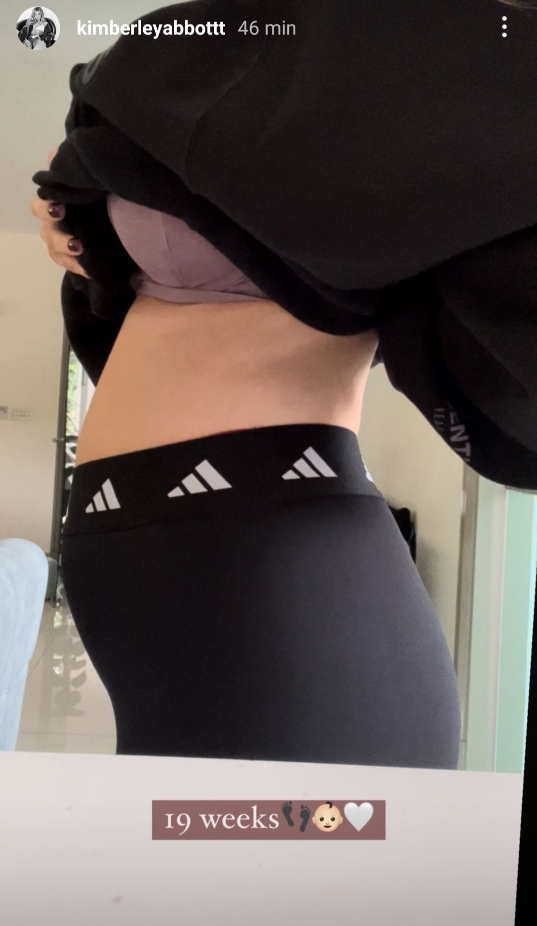 En la foto se puede ver a Abbott vistiendo ropa deportiva y luciendo su pancita de embarazo. "19 weeks (semanas)", escribió junto a emojis de pies, una guagua y un corazón blanco.