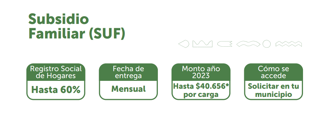El SUF es un aporte monetario mensual destinado a personas de escasos recursos que no están afiliadas a un sistema previsional.  El monto es de hasta $40.656 por carga y lo pueden solicitar en el municipio las madres, padres, guardadores o personas a cargo de personas menores de 18 años o personas con invalidez o discapacidad mental de cualquier edad, de escasos recursos y que no cuentan con previsión social.