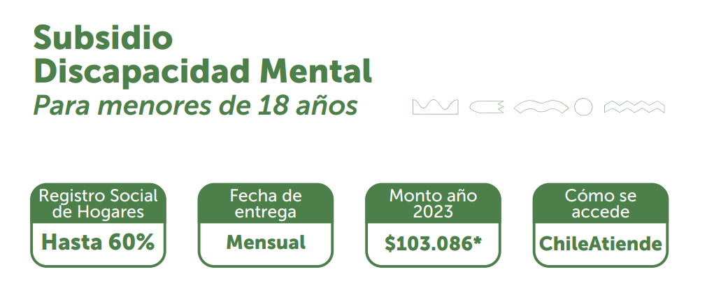 El Subsidio Discapacidad Mental es un aporte económico mensual que se entrega a menores de 18 años de escasos recursos que están en situación de discapacidad mental, física o sensorial severa.  Para obtenerlo, las personas deben tener menos de 18 años y contar con una resolución del Compin y/o credencial del Registro Nacional de Discapacidad vigente, además de tener residencia continua en el país como mínimo tres años anteriores a la fecha de postulación. El monto para este 2023 es de $103.086.