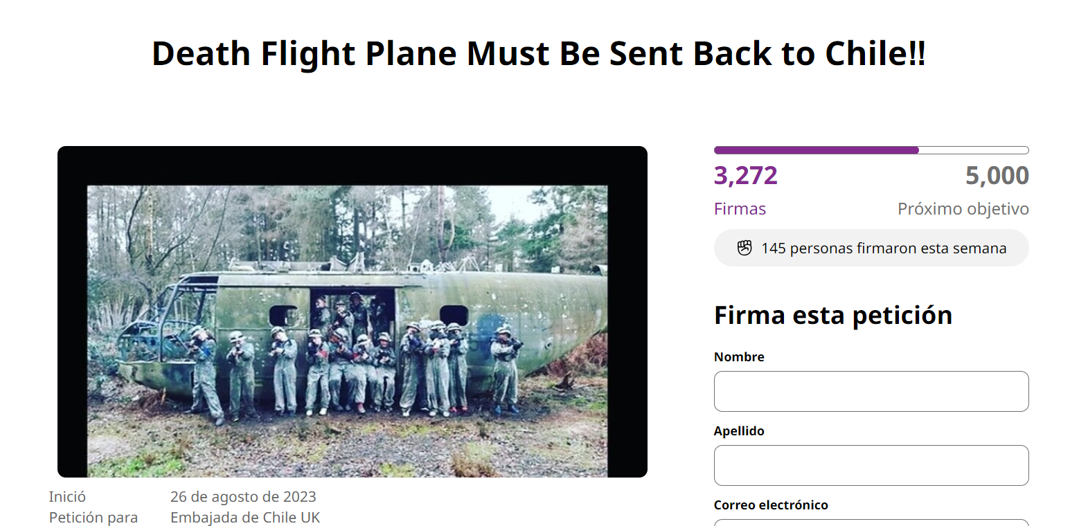 "No es justo ni moral que un avión donde hombres y mujeres fueron lanzados a sus muertes siga en el Dogtag Airsoft. El avión es sitio de memoria y tiene que ser devuelto a Chile ya", expuso en la descripción de esta petición que ya suma más de 3 mil firmas.