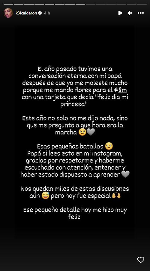 "Este año no sólo no me dijo nada, sino que me preguntó a qué hora era la marcha (...) Papá, si lees esto en mi Instagram, gracias por respetarme y haberme escuchado con atención", escribió con mucha emoción Calderón.