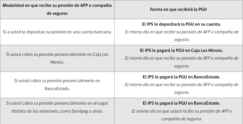 Por ejemplo, si a usted le depositan la pensión en una cuenta bancaria, el IPS le depositará la PGU en su cuenta el mismo día en que recibe su pensión de AFP o compañía de seguros.