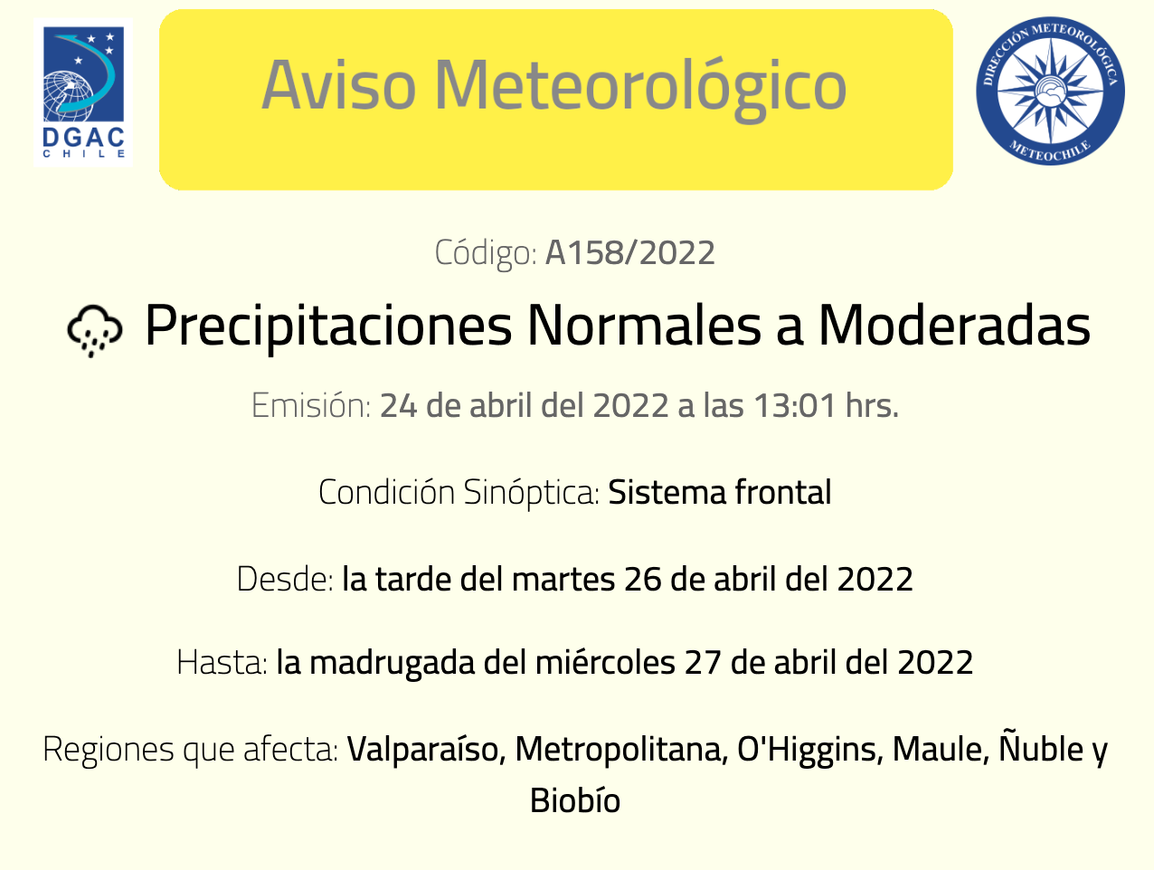 La Dirección Meteorológica emitió este domingo un aviso por precipitaciones normales a moderadas que se registrarán en seis regiones de Chile.