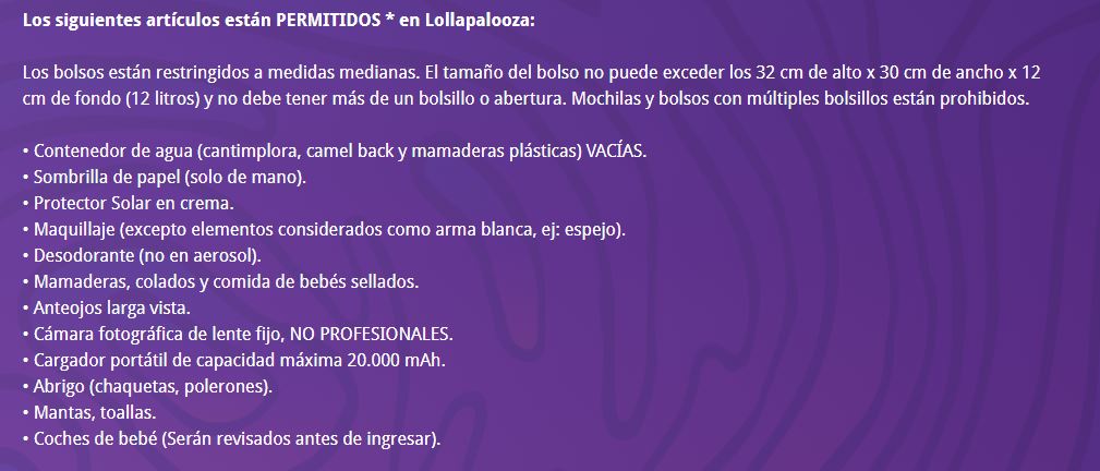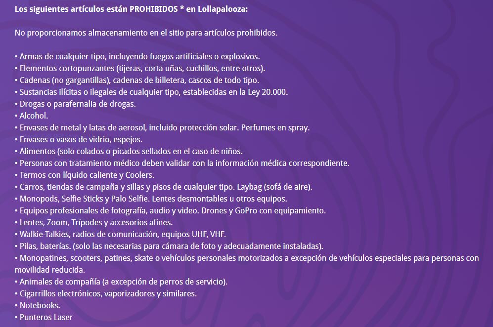Desde la página oficial de Lollapalooza Chile, informaron los elementos prohibidos y permitidos para llevar al festival.