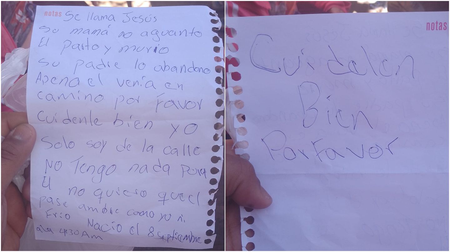 Se trata de Belén Gutiérrez, quien no solo encontró la guagua, sino también una nota: "Se llama Jesús. Su mamá no aguantó el parto y murió. Su padre lo abandonó apenas él venía en camino. Por favor, cuídenlo bien, yo solo soy de la calle y no tengo nada para él. No quiero que él pase hambre como yo ni frío. Nació el 8 de septiembre a las 04:30 am. Cuídenlo bien, por favor".