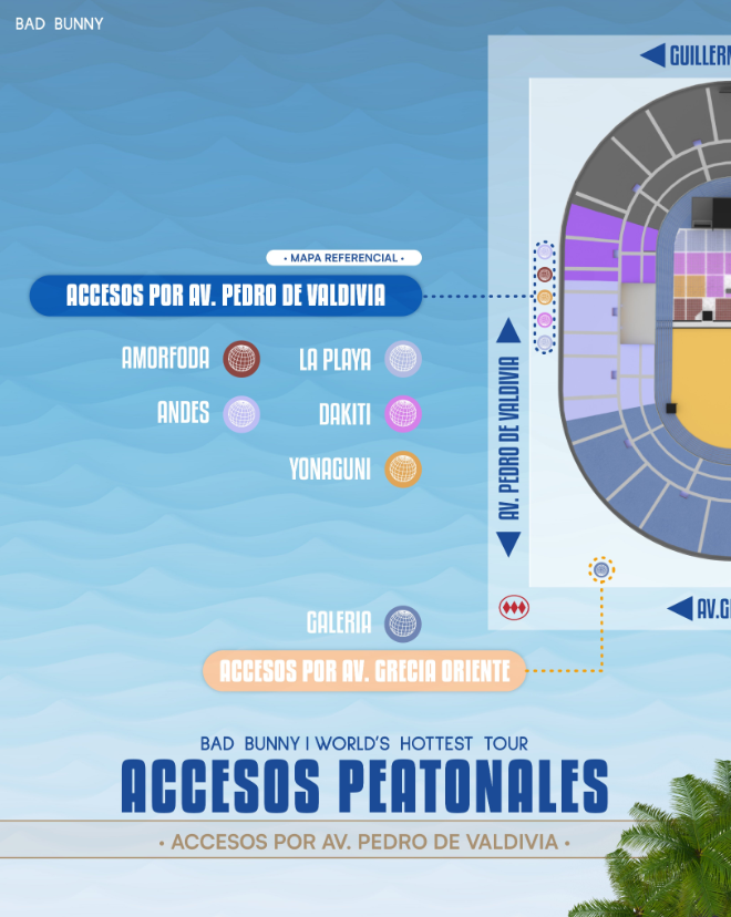 Aquellos asistentes al evento que tengan tickets para los sectores Amorfoda, La Playa, Andes, Dákiti y Yonaguni, deberán acceder por Av. Pedro de Valdivia.