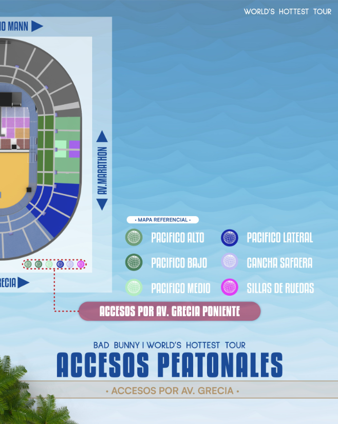 En cambio, Pacífico Alto, Bajo, Medio, Lateral, Cancha Safaera y Sillas de Ruedas será por Av. Grecia Poniente.