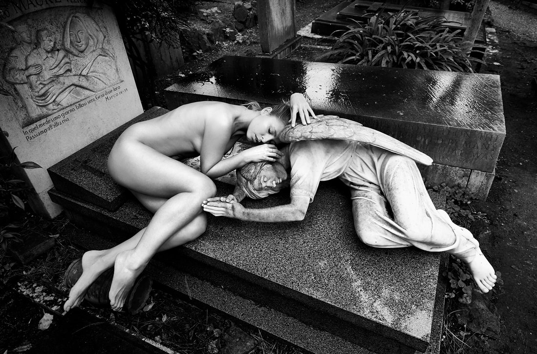 Entre las imágenes extraídas de la sesión fotográfica, destaca una donde aparece sin ropa cruzando un paso de cebra y cargando una enorme cruz de madera, mientras de fondo se puede apreciar la basílica de San Pedro.