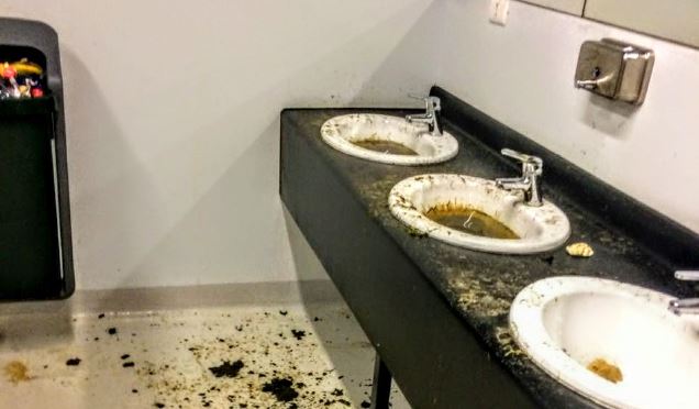 En las fotos se ven lavamanos tapados, con aguas sucias y desperdicios en el suelo, además de basura acumulada en las esquinas donde se aprecian envases de barritas de cereal y botellas de agua desgacificada.