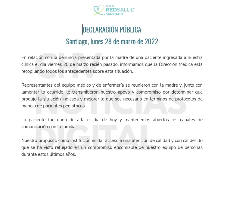 Al ser contactados por CHV Noticias digital, desde la entidad médica enviaron un comunicado en relación a este caso. Aseguraron que desde la Dirección Médica se está recopilando todos los antecedentes sobre esta situación y que buscarán "mejorar lo que sea necesario en términos de protocolos de manejo de pacientes pediátricos".