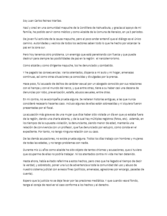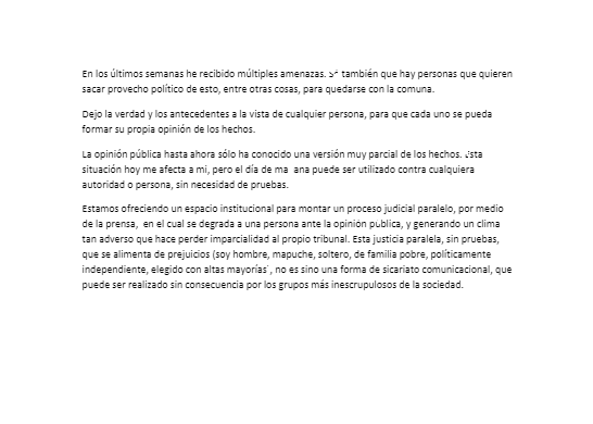 versión muy parcial de los hechos. Esta situación hoy me afecta a mí, pero el día de mañana puede ser utilizado contra cualquiera autoridad o persona, sin necesidad de pruebas”, advierte.
