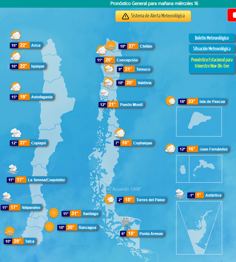 Lee también: ¡Con entrada liberada! Comienzan las inscripciones para seguir el evento ambiental más austral de ChileDe acuerdo a la Dirección Meteorológica de Chile, este 15 de noviembre la máxima llegará a los 31° y la mínima será de 11°.
