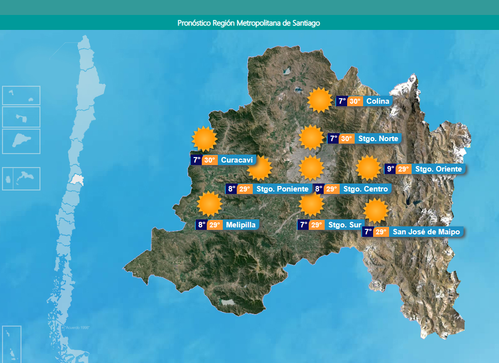 La ola de calor ya es un hecho y comenzará este viernes con una máxima de 29° en el centro de Santiago, llegando a los 30° en Colina, Curacaví y Santiago Norte, de acuerdo a lo informado por la Dirección Meteorológica de Chile.
