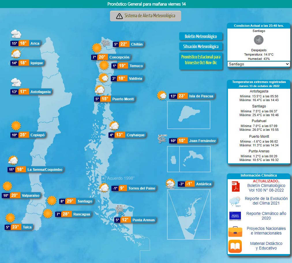 El resto del país, en tanto, este viernes se mantendrá con una temperatura promedio, llegando a los 25° en la ciudad de Copiapó, 20° en Valparaíso y 19° en Temuco.