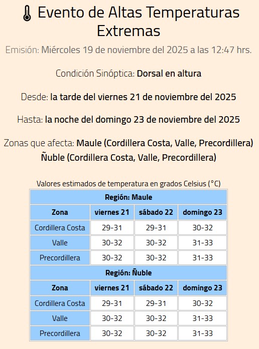 Las regiones afectadas son Maule y Ñuble, tanto para sus zonas de la Cordillera de la Costa, el valle y precordillera.