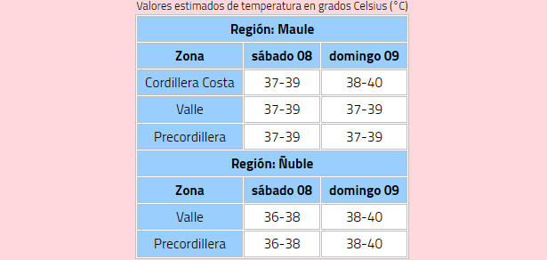 Respecto a cuántos grados se estima que lleguen los termómetros en estas zonas, en la región del Maule se espera que este sábado ronden los 37-39°, mientras que el domingo varíen entre 38°-40° y 37°-30°, según el lugar.