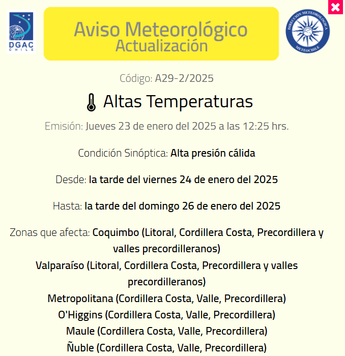 La Dirección Meteorológica de Chile emitió un aviso por altas temperaturas vigentes desde la tarde de este viernes 24 a la tarde del domingo 26 de enero.