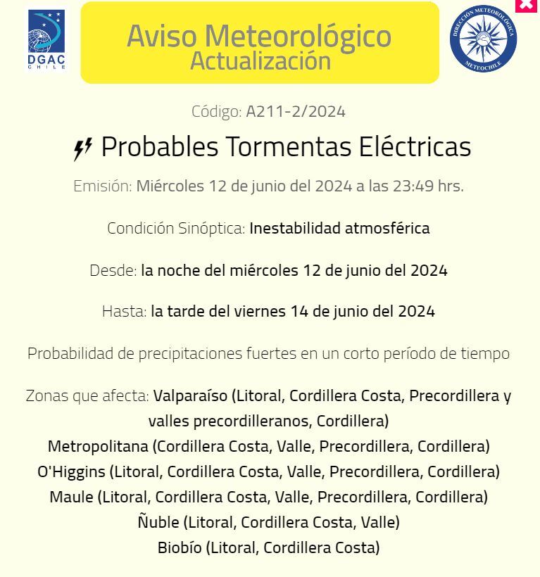 La Dirección Meteorológica de Chile (MeteoChile) emitió un Aviso Meteorológico por pobables tormentas eléctricas en seis regiones del país.