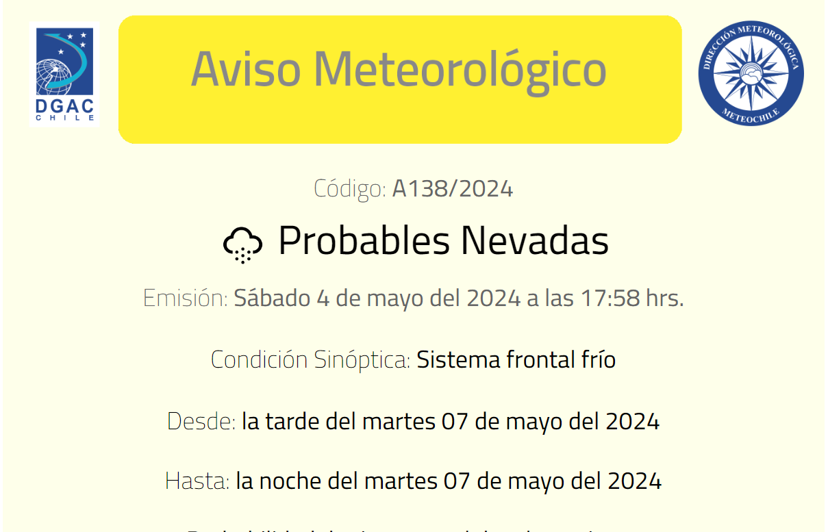 Este sábado la Dirección Meteorológica de Chile (DMC) emitió un anuncio de "probables nevadas" en tres diferentes regiones de la zona centro de nuestro país.