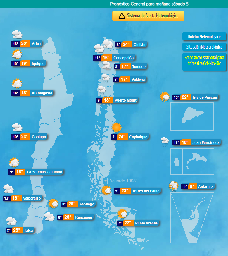 En Antofagasta, por ejemplo, la máxima será de 18°, en Copiapó subirá a 23° y Valparaíso alcanzará los 18°.