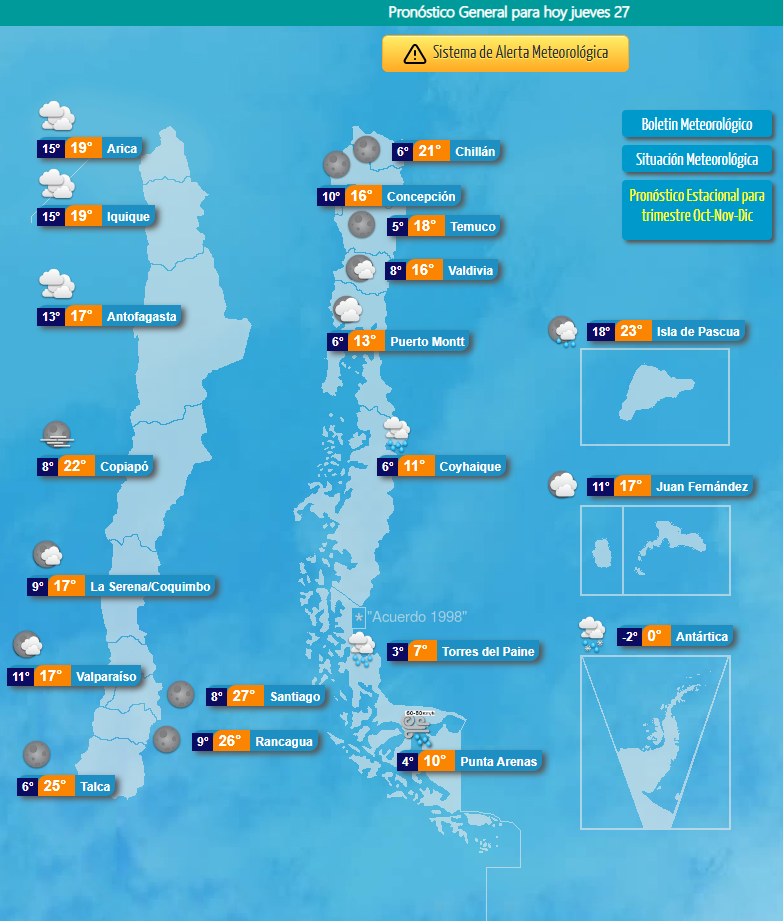 Este jueves 27 de octubre, la zona norte del país rondará entre los 17° a 22°, como por ejemplo en Copiapó. En Valparaíso, en tanto, los termómetros marcarán una máxima de 17°.
