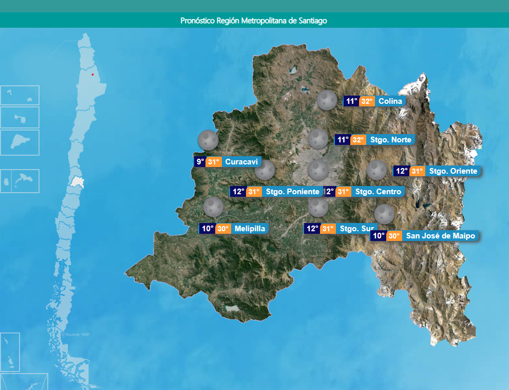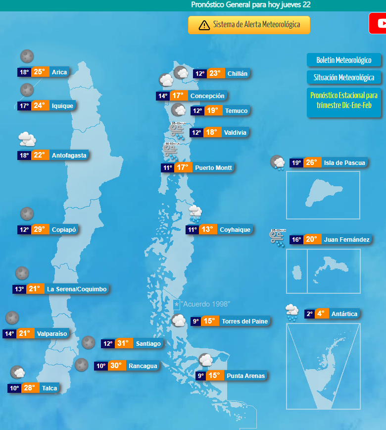 Este jueves 22 de diciembre los termómetros marcarán una mínima de 12° y una máxima de 31° en la capital del país, de acuerdo a la Dirección Meteorológica del Chile.