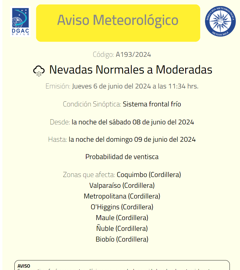 Según la Dirección Meteorológica de Chile, las nevadas serán de normales a moderadas y existe probabilidad de ventisca en las siguientes regiones: