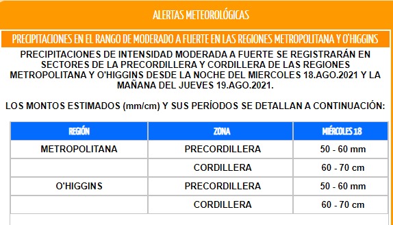 #ONEMIRM #ONEMIAlerta Se declara #Alerta Temprana Preventiva Regional para la Región Metropolitana por evento meteorológico. Infórmate en https://t.co/YNvXk3kBJv pic.twitter.com/OVdXpYIzLC— onemichile (@onemichile) August 15, 2021